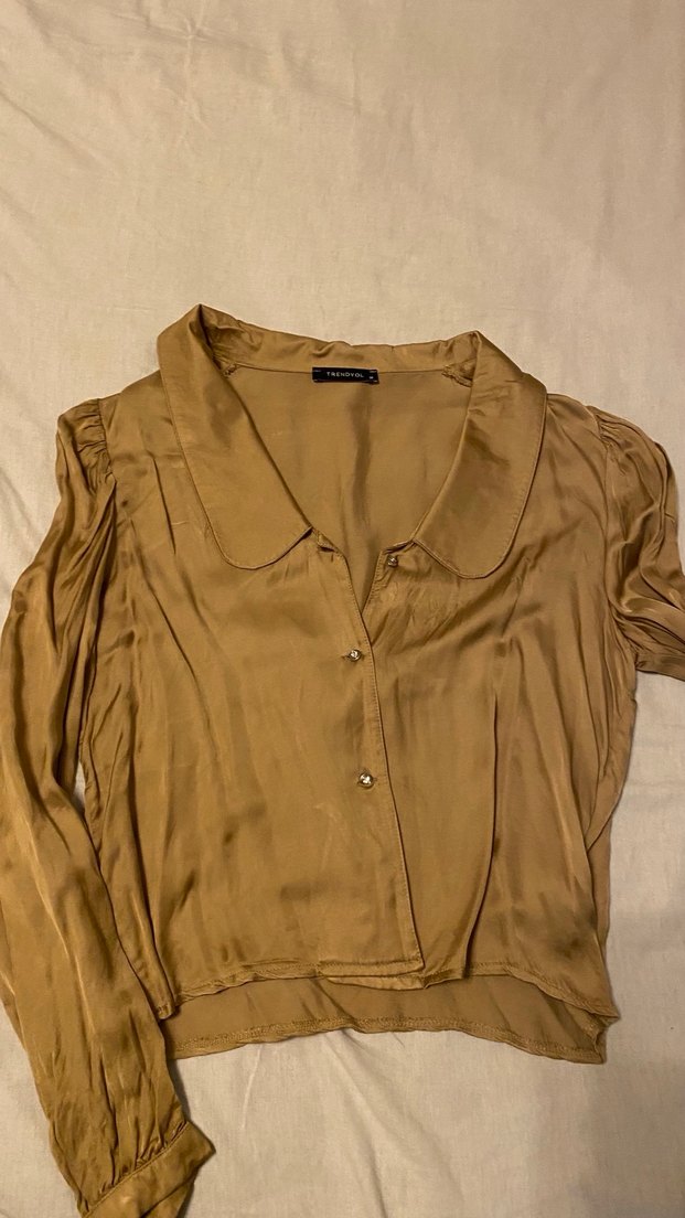 Bej renkte, düğmeli ve yakalı uzun kollu kadın gömleği. Saten kumaştan, bol kesim ve parlak dokusuyla günlük kullanım için uygundur.✨
