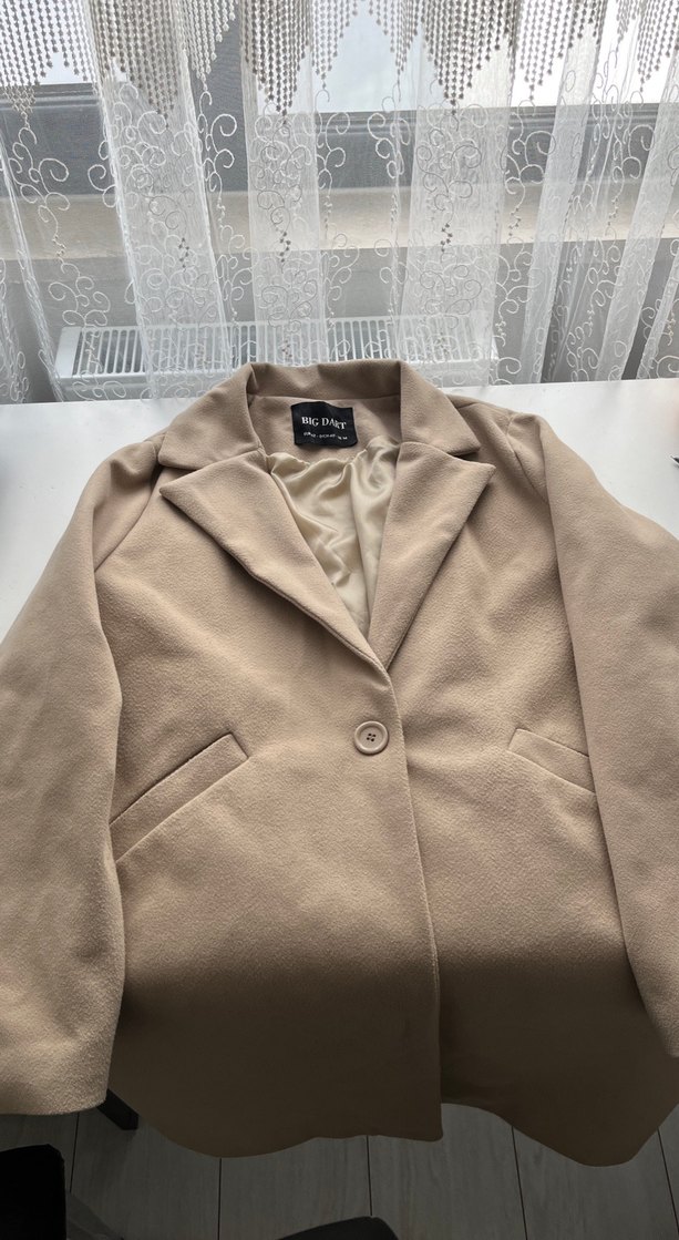 Bej renkli kadın kaban, düğmeli ve süet dokulu. Notlu yaka, uzun kollu ve midi boyda, günlük sokak stiline uygun rahat kesim bir parça.