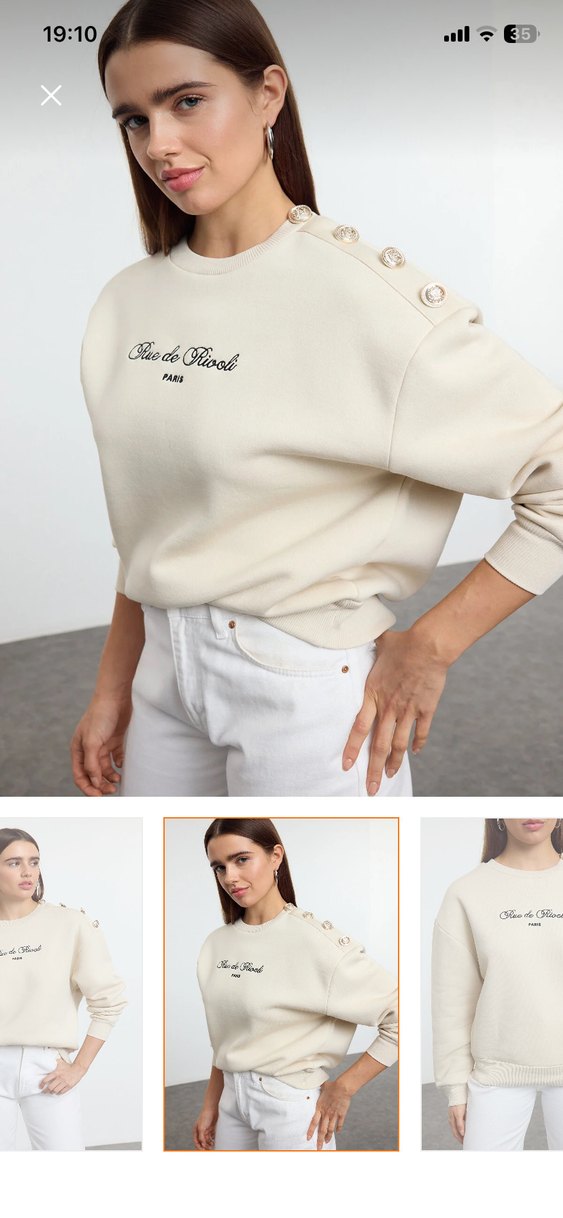 Bej renk, pamuk kumaştan, uzun kollu, yuvarlak yaka ve düğme detaylı salaş kesim kadın sweatshirt. Önü baskılıdır, günlük kullanım için uygundur.