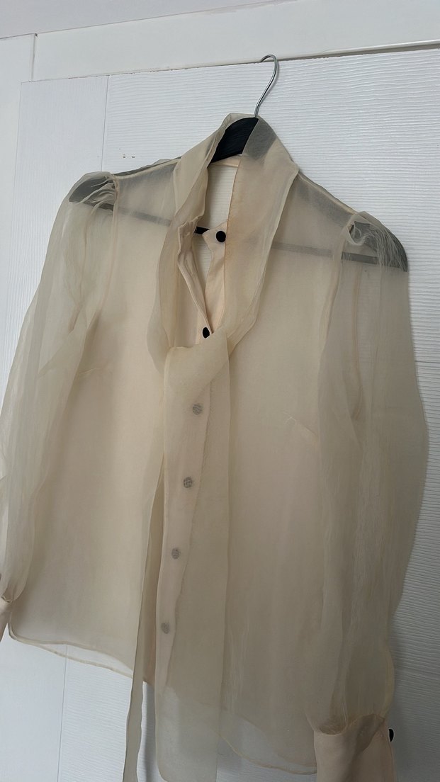 Bej renkli, düğmeli ve yakalı kadın gömleği. Uzun kollu, bol kesim ve midi boyda, çağdaş ofis stiline uygun minimal tasarım.