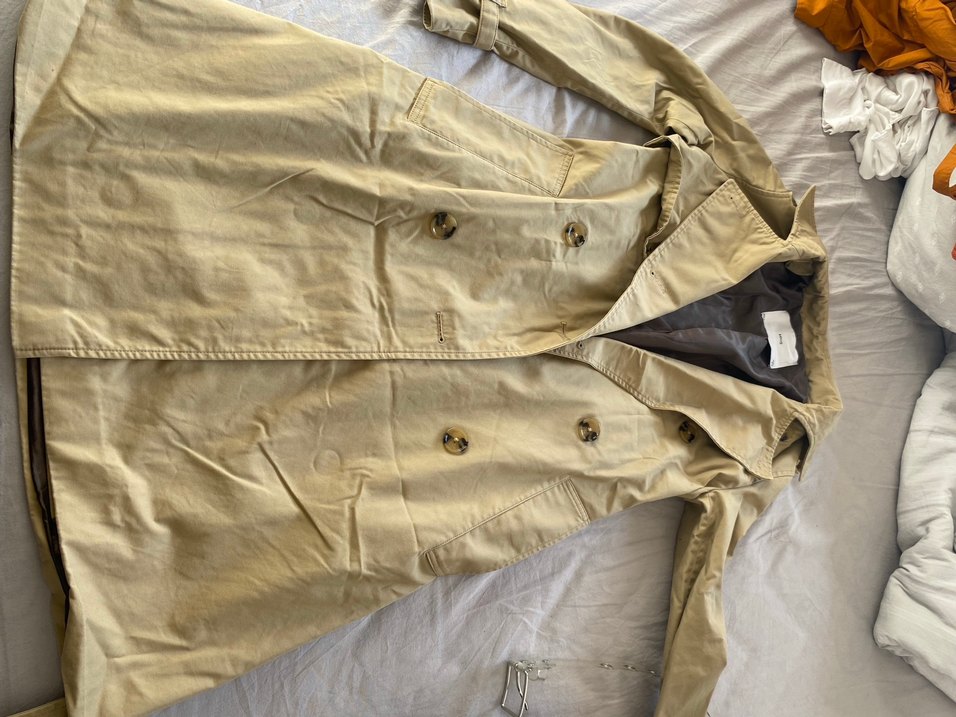 Bej renkli, düğmeli, keten kumaştan yapılmış kadın trençkotu. Parlak yüzeyli, notched yaka, salaş kesim ve askılı kollara sahip, midi boydadır. Günlük kullanıma uygundur. Boyu midi klasik kesim bir trençkottur