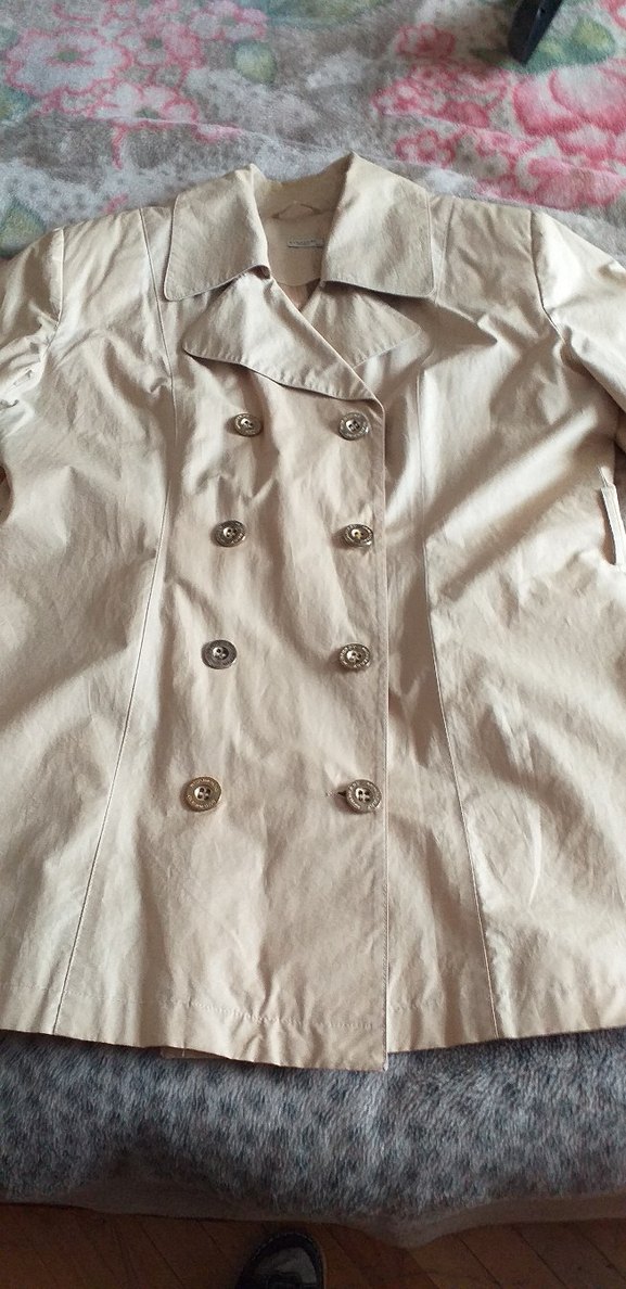 Bej renkli, düğmeli ve kesimli yaka detaylı kadın trençkotu. Uzun kollu ve midi boyda, günlük kullanıma uygun rahat bol kesim.