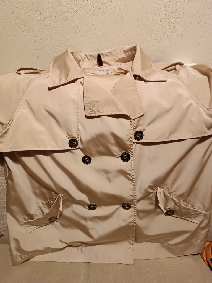 Açık bej renk, düğmeli, kisa boy.bol kesim kadın trençkot. orijinal.sorunsuz.temiz.2 kol arasi 56 cm aşağıya doğru hafif genişliyor A kesim gibi.44 beden ama 46 bedene de rahat oluyor.parasut kumaş