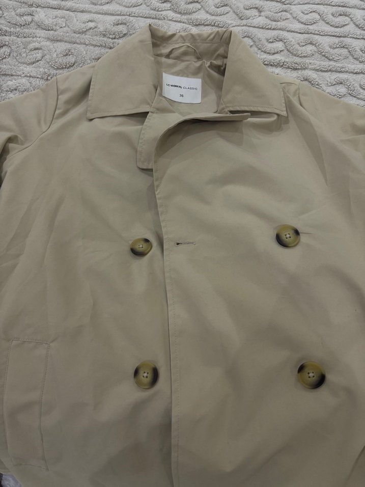 Bej renkli, düğmeli ve kırmalı yaka detaylı kadın trençkotu. Rahat kesimi ve uzun kolları ile günlük kullanıma uygun, sentetik kumaştan üretilmiştir.