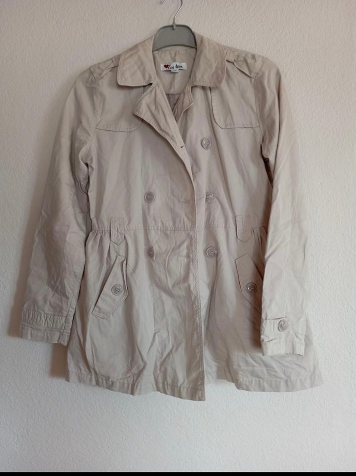 Bej kadın trençkot, düğmeli ve notalı yakalıdır. Uzun kollu, bol kesim ve normal boydadır, rahat sokak stili için uygundur. 15 yaş için uygundur