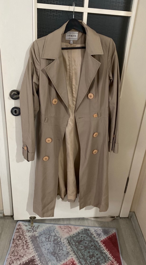 Bej renginde, düğmeli ve uzun kollu kadın trençkot. Notch yaka ve regular fit kesime sahip, ofis ve günlük kullanım için uygun. Uzunluk. 111 cm iki kol arası. 42 cm hiçbir defosu yoktur