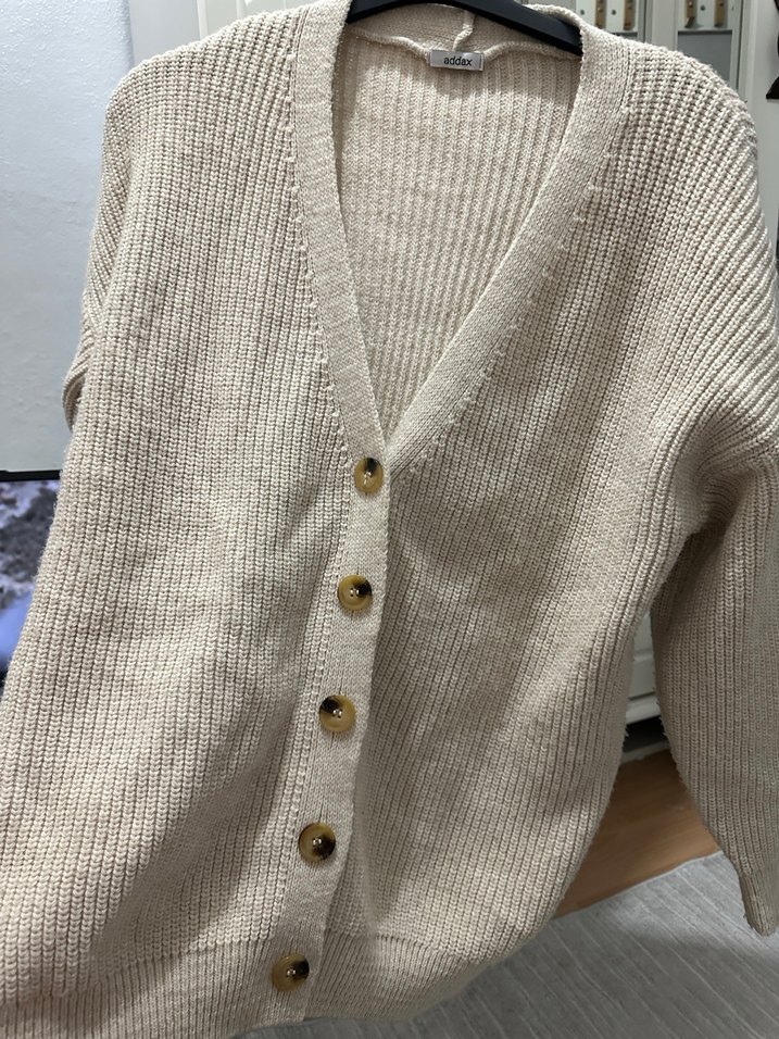 Uzun kollu, bej renk düğmeli triko hırka, rahat ve bol kesim. Günlük kullanıma uygun, konforlu bir parça.