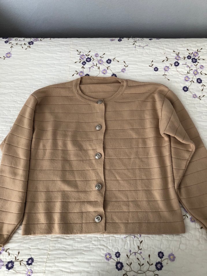 Bej renkte, düğmeli, yuvarlak yaka uzun kollu triko hırka. Rahat kesimi ve sade tasarımıyla günlük kullanıma uygundur. ihtiyaçtan satılık m l bedene uygundur