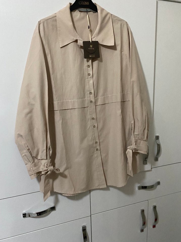 Bej renkli, iki kol arası 52 cm boy 80 cm uzun kollu ve düğmeli kadın gömlek. Geniş kesimli ve normal boyda, ofis ve günlük kullanım için uygundur.