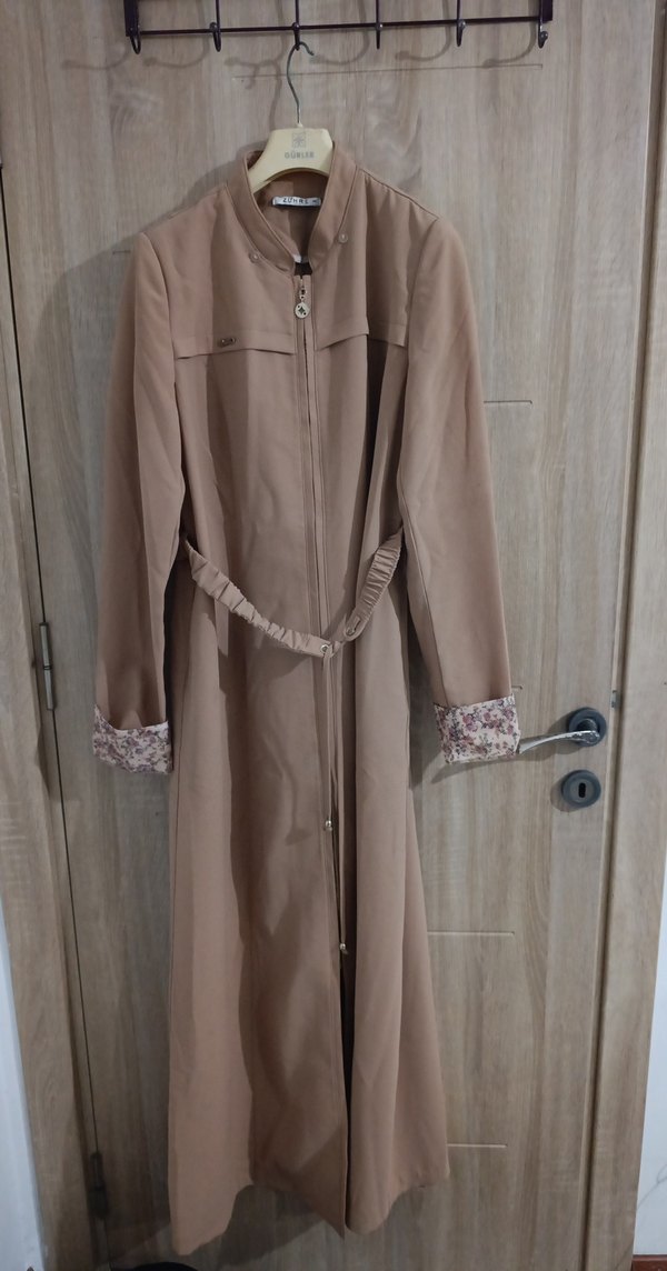 Bej renkli, düğmeli uzun kadın pardesü regular fit ve notched lapel yakaya sahiptir. Uzun kollu ve kemerli, yumuşak sentetik kumaştan, manşetlerde hafif çiçekli desen bulunur çok az kullanıldı omuzdan etek ucuna kadar 150 tek yön 50 kol uzunluk 60