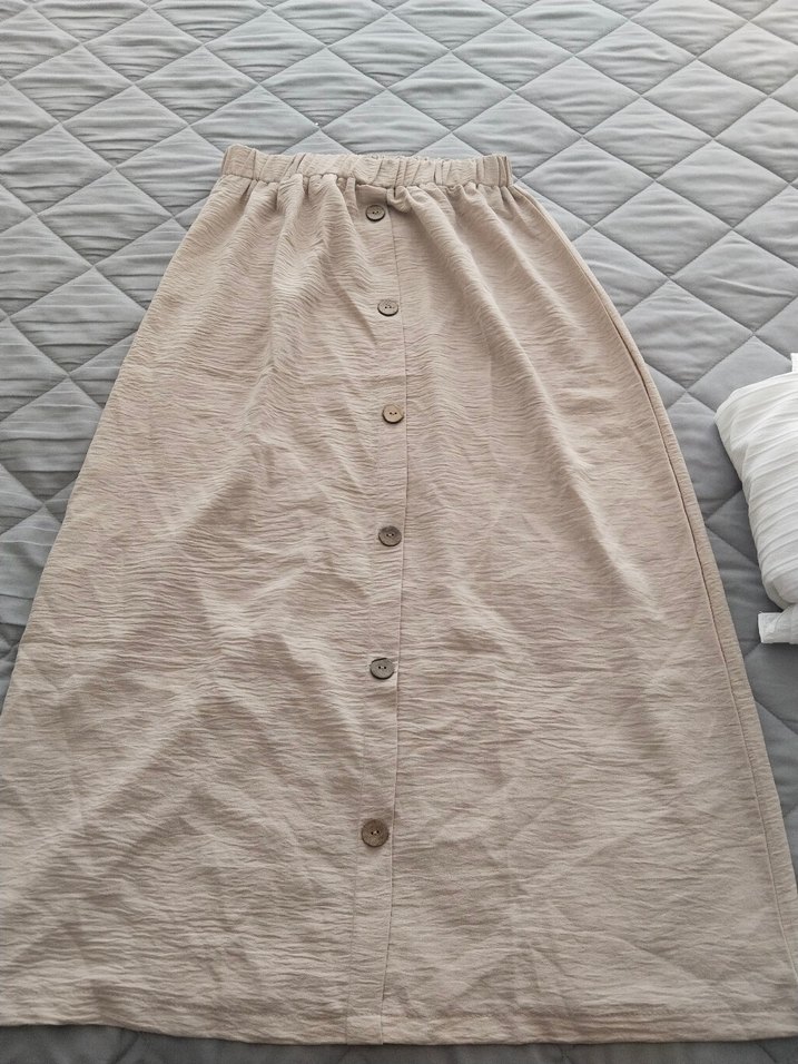 Bej renkli, düğmeli ve bol kesim uzun keten kumaştan yapılmış kadın eteği. Sade tasarımıyla bohem stiline uyum sağlar ve günlük kullanım için uygundur.