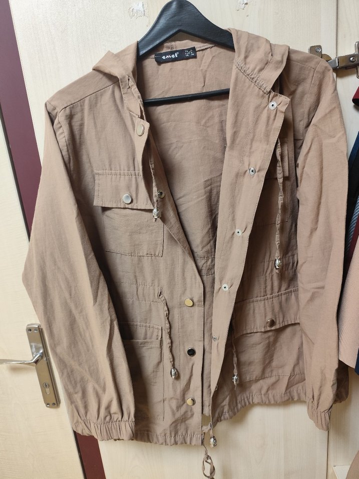 Bej renginde, düğmeli, uzun kollu, keten kumaştan kadın ceket. Salaş kesim ve çıtçıtlı yakasıyla günlük rahat kullanıma uygun.