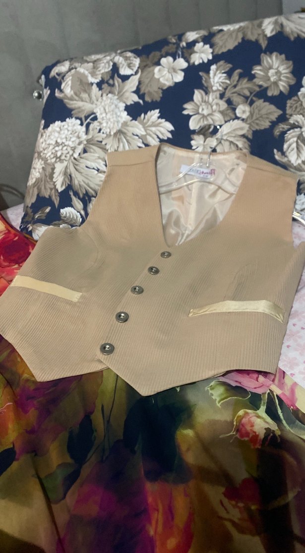 Bej renkli, düğmeli ve yakalı kolsuz kadın yeleği. Sentetik kumaştan, normal kesim ve midi boyda, ofis için uygun.
