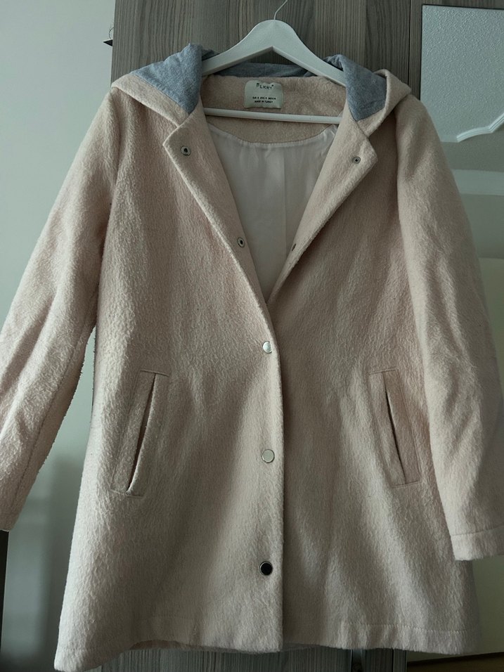 Bej renkli, düğmeli ve kapüşonlu kaban. Yumuşak ve sıcak kumaştan, normal boyda ve rahat kesimlidir. Uzun kolludur.