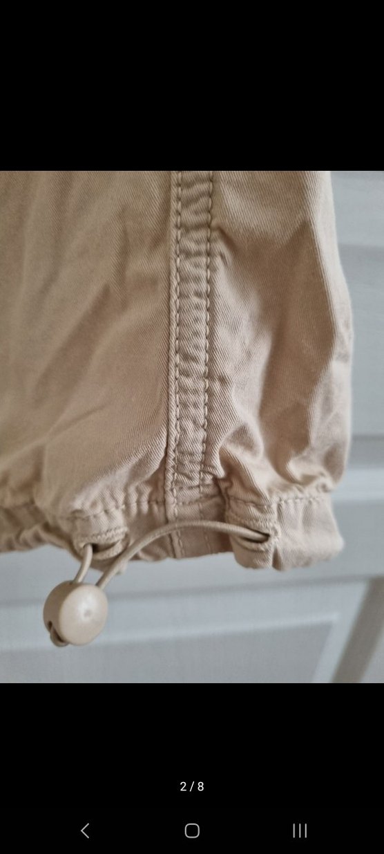 Bel 71 paça 51cm. Keten kumaştan bej, düğmeli, bol kesim kargo pantolon. Minimalist tarzda, rahat ve dış mekan kullanımı için uygun.