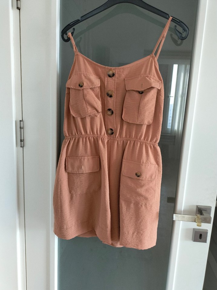 Bej keten kumaştan, düğmeli ve cepli, askılı, bol kesim tulum. Straplez yakalı ve kolsuz, günlük rahat stil için uygundur.