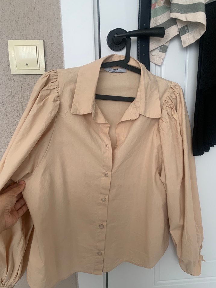 Bej keten gömlek, düğmeli, yakalı ve uzun, balon kollu. Rahat kesim ve normal midi boyda, ofis ve günlük kullanım için uygun.