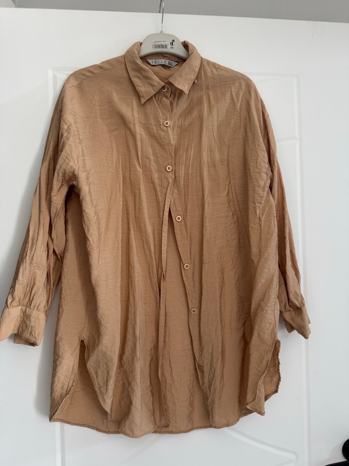 Bej keten gömlek, düğmeli ön ve yakalı. Uzun kollu, bol kesim ve parlak yüzeye sahip, günlük kullanıma uygun.