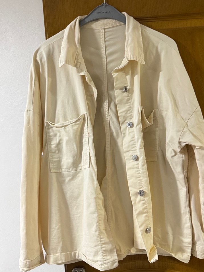 Bej keten kumaştan, düğmeli, uzun kollu, yakalı ve cepli rahat kesim gömlek. Günlük sokak stili için uygun. Likralıdır