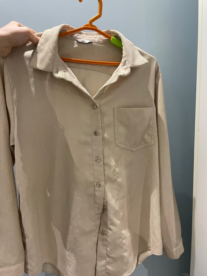 Bej keten gömlek, düğmeli ön, yakalı ve uzun kollu tasarıma sahiptir. Rahat kesimi ve cep detayıyla gündelik sokak stiline uygundur.