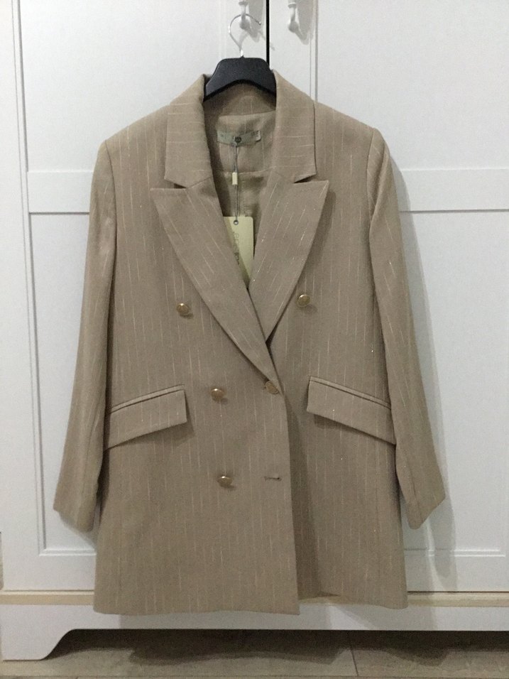 Bej renkli, keten kumaştan yapılmış, düğmeli kadın blazer. Normal kesim, uzun kollu ve midi boyda, ofis için uygun klasik tarzda.