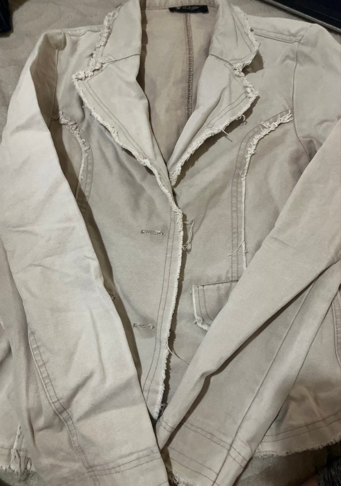 Bej keten kumaştan, düğmeli, uzun kollu, normal kesim ve notched lapel yakalı kadın ceket. Günlük sokak stili için uygundur.