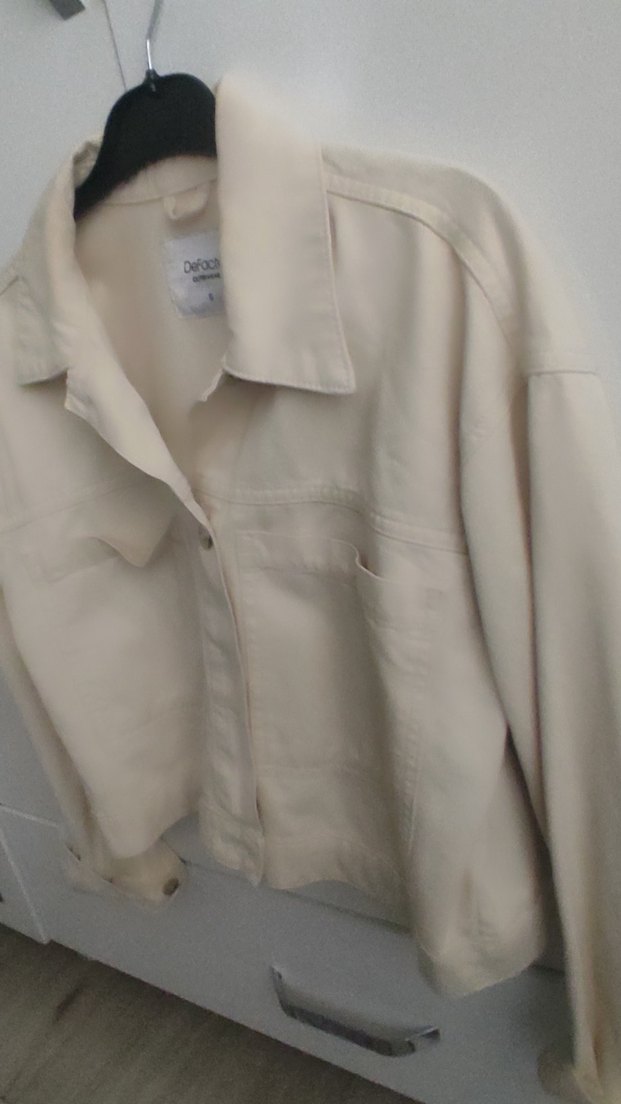 Bej renkte, keten kumaştan, düğmeli, uzun kollu, notched lapel yakalı, midi uzunlukta ve bol kesim kadın ceket. Minimalist tarzda günlük kullanım için uygun.