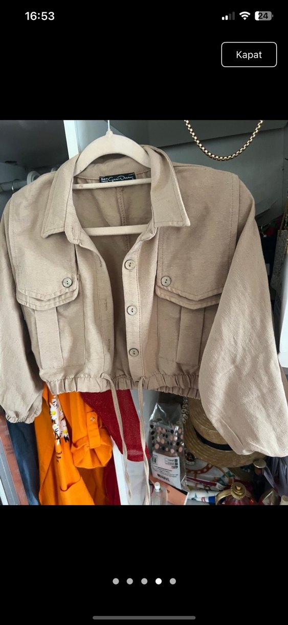 Bej renkli keten kumaştan yapılmış, düğmeli, uzun kollu ve notched lapel yakalı midi uzunlukta kadın ceket. Salaş kesimiyle günlük sokak stiline uygundur. Beden s yazıyor ama xs bedene daha iyi olur