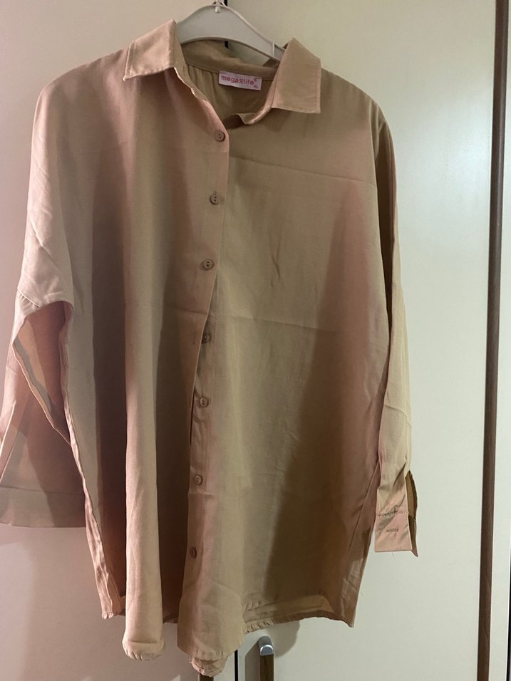Bej renkli keten kumaştan, düğmeli, uzun kollu, yakalı ve midi boyda bol kesim kadın gömlek. Minimalist ve günlük kullanıma uygun.