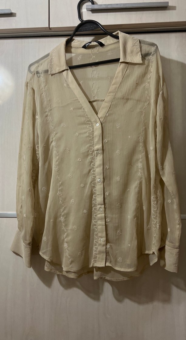 Bej keten kumaştan, düğmeli, V yaka, uzun kollu, bol kesim ve midi boy kadın gömleği. Bohem Paris tarzını yansıtır. Etiket S ama M beden uyumludur
