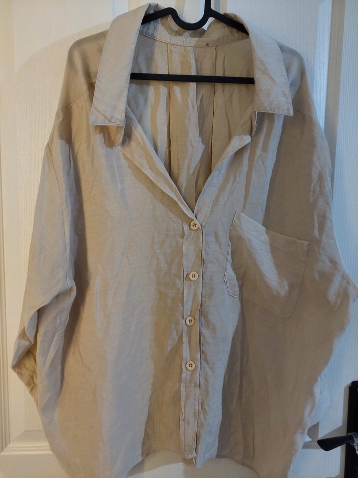 Bej renkli keten kumaştan, düğmeli, uzun kollu, cep detaylı bol kesim gömlek