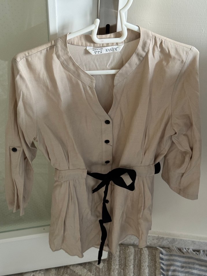 Bej renkli keten kadın gömlek, uzun kollu ve V yakalıdır. Düğmeli ön kısmı ve siyah bel bağı ile rahat bir görünüm sunar.