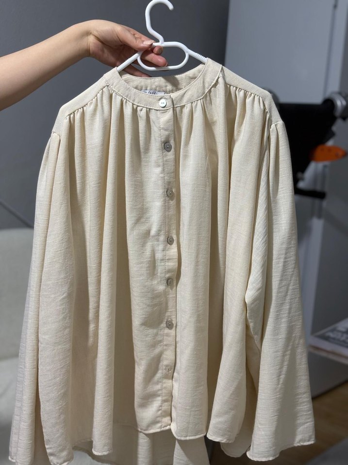 Bej keten kumaştan, düğmeli, yuvarlak yaka, uzun kollu, midi boy ve bol kesim kadın gömlek.