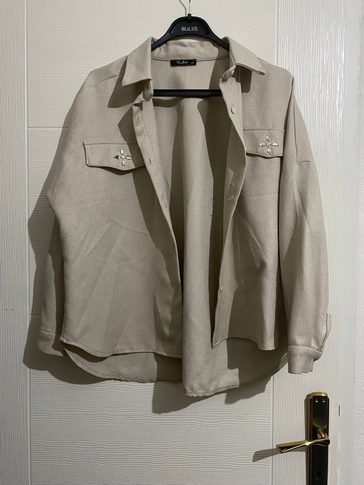 Bej keten kumaştan, düğmeli ve yaka detaylı kadın gömlek. Bol kesim ve uzun kollu, günlük rahat kullanıma uygun minimal tasarım.