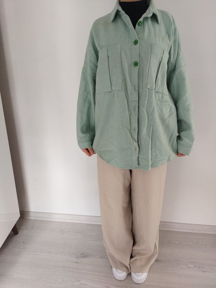 Bej renkte keten, düğmeli, uzun kollu, notched lapel yaka ve bol kesim kadın gömlek. Günlük kullanım için uygundur.