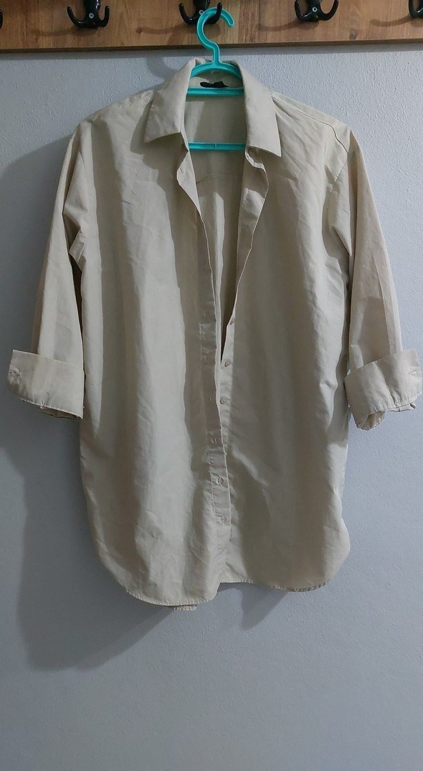 Bej renkli keten kumaştan, düğmeli, uzun kollu ve yakalı kadın gömleği. Rahat kesimi ve sade tasarımıyla günlük kullanıma uygundur.