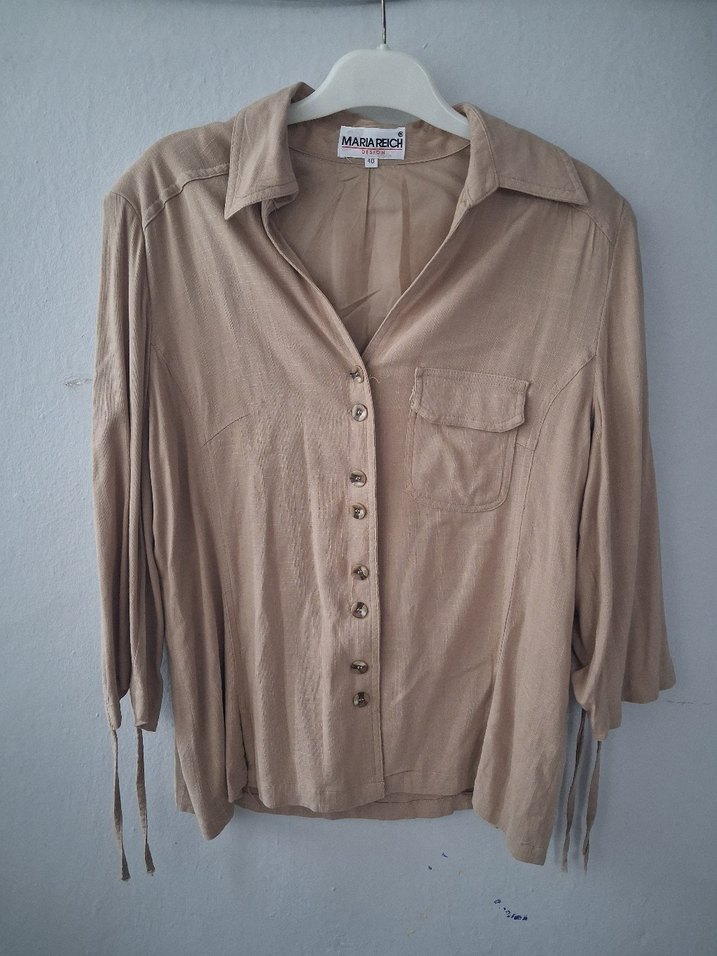 Bej keten kadın gömlek, düğmeli, yakalı, uzun kollu ve bol kesimdir. Günlük kullanıma uygun sade bohem tarzda tasarlanmıştır.
