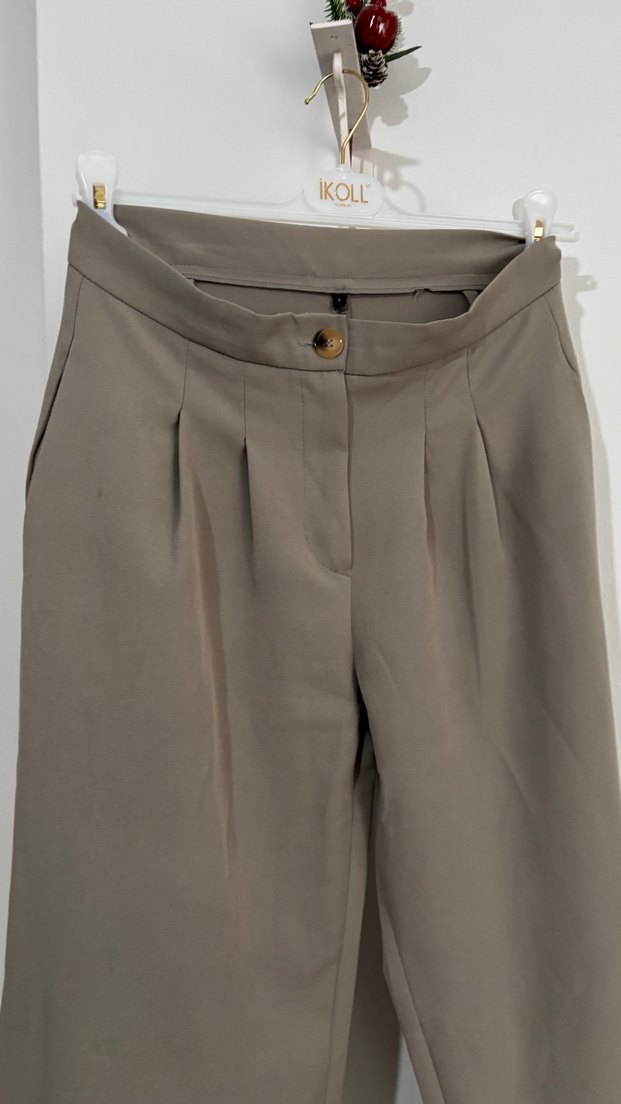 Bej keten kumaştan, düğmeli ve kısa kesime sahip kadın pantolon. Ofis kullanımına uygun, desen içermeyen, trend günlük stil için ideal.