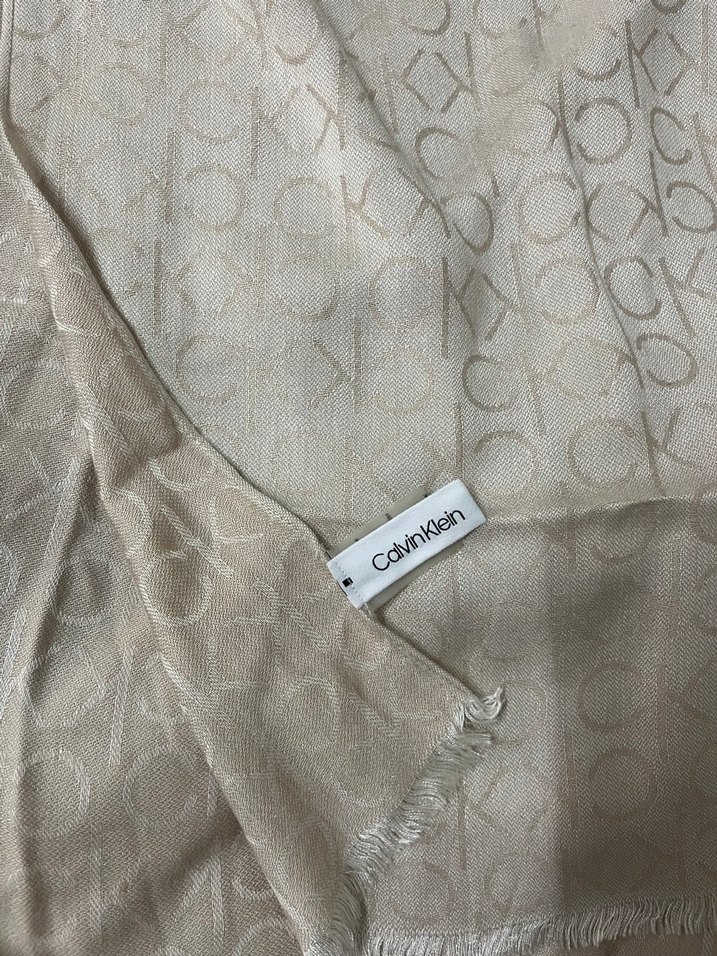 Bej keten dokulu, düğmeli kadın şalı, gri desenli ve konforlu, çağdaş tarzda Calvin Klein imzalı.