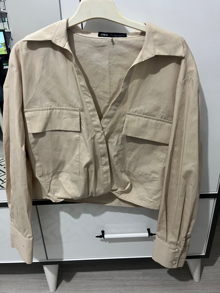 Uzun kollu, bej renkli keten kısa gömlek. Düğmeli ve yakalı, bol kesim rahat bir tarz sunar.