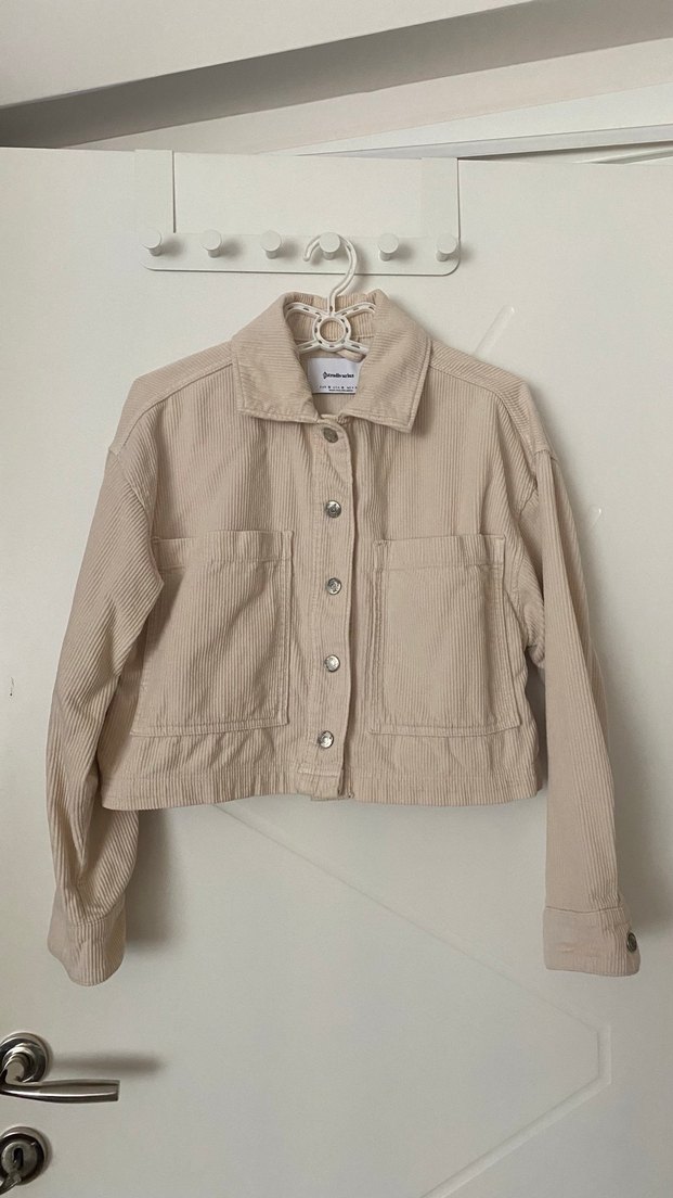 Bej keten kumaştan, düğmeli, uzun kollu, notched lapel yakalı, iki büyük cepli, bol kesim midi ceket. Günlük rahat sokak stili için uygundur.