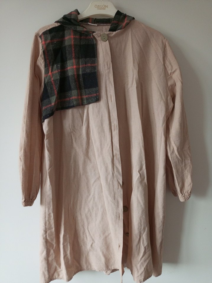Bej renkte keten gömlek, yakalı, uzun kollu ve bol kesimdir. Düğmeli ön kısmı ve midi boyu günlük kullanıma uygundur. Ek olarak ekose desenli şal detayı bulunur.