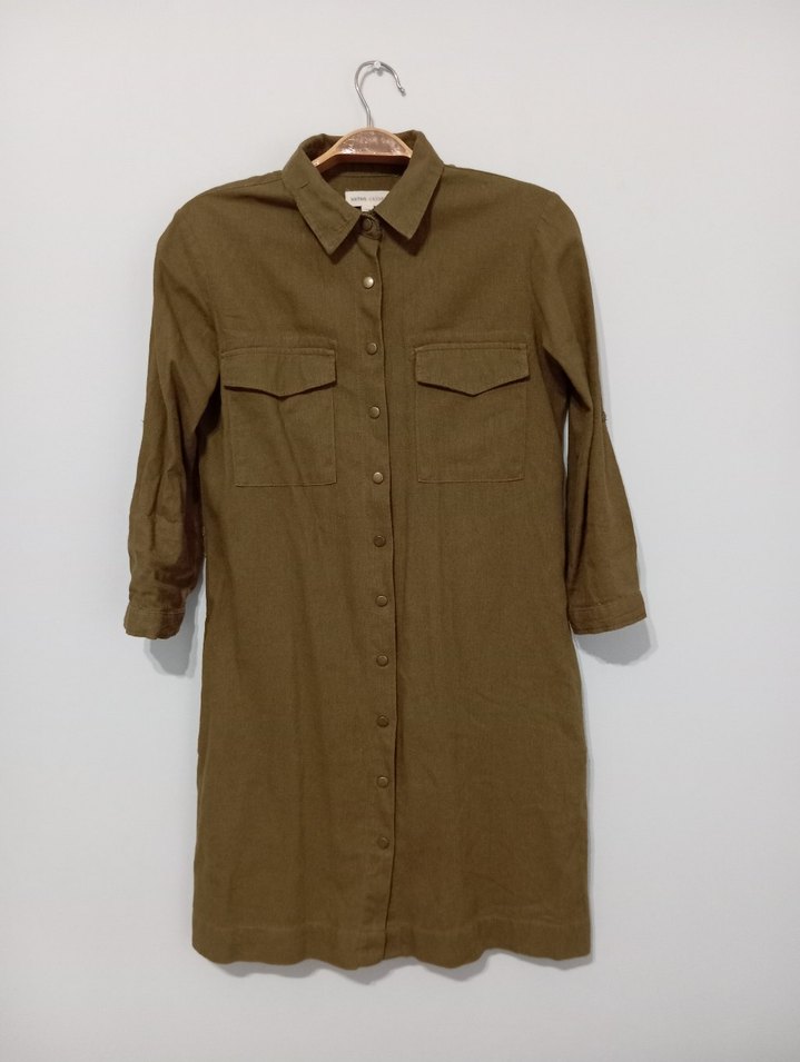 Bej Düğmeli Keten Midi Gömlek elbise