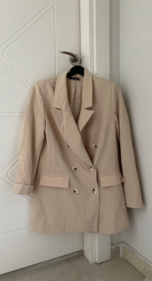 Bej keten kumaştan, düğmeli ön ve kesik yaka detaylı midi uzunlukta kadın blazer ceket. Uzun kollu, klasik şıklık için ideal.