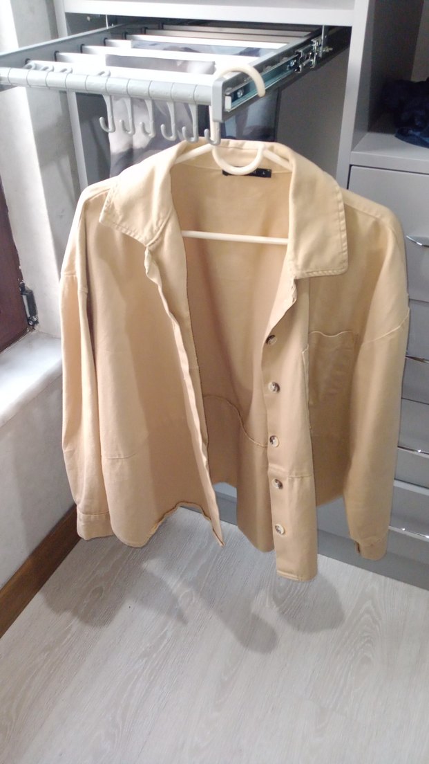 Bej keten kumaştan, düğmeli, yakalı ve uzun kollu, bol kesim midi kadın ceket. Trendy rahat sokak stili için uygundur.
