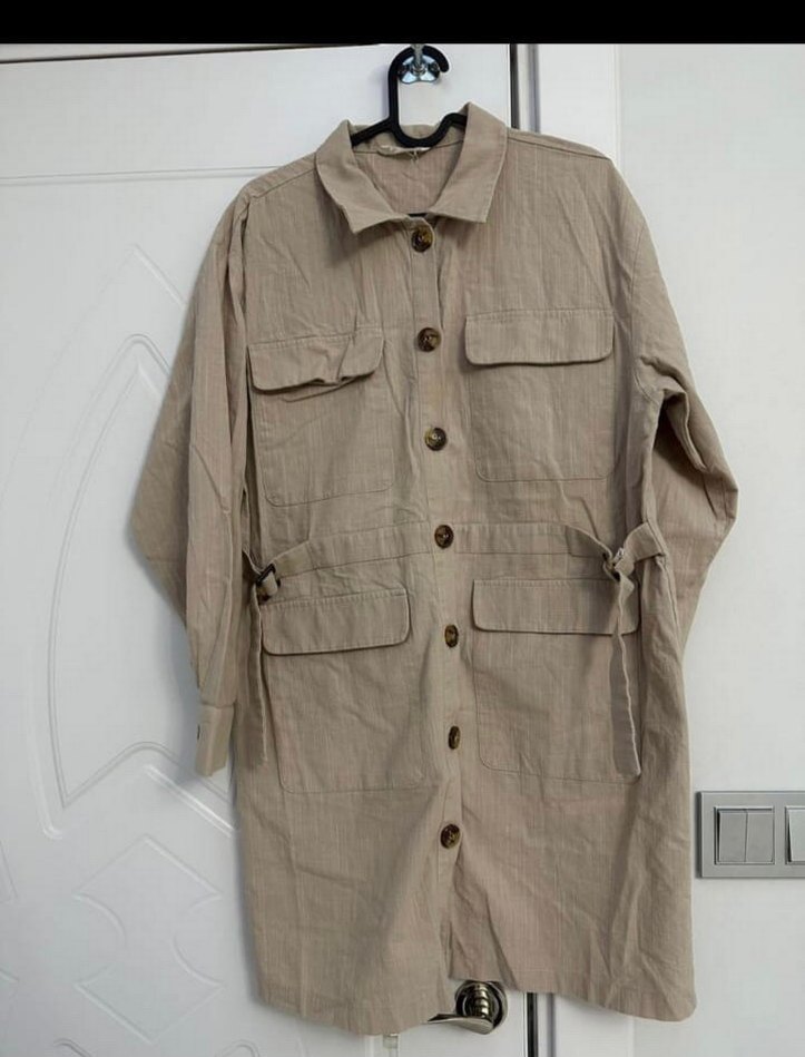 Bej keten midi trençkot, uzun kollu ve düğmeli. Notlu yakalı, regular fit ve günlük rahat stil için uygun.