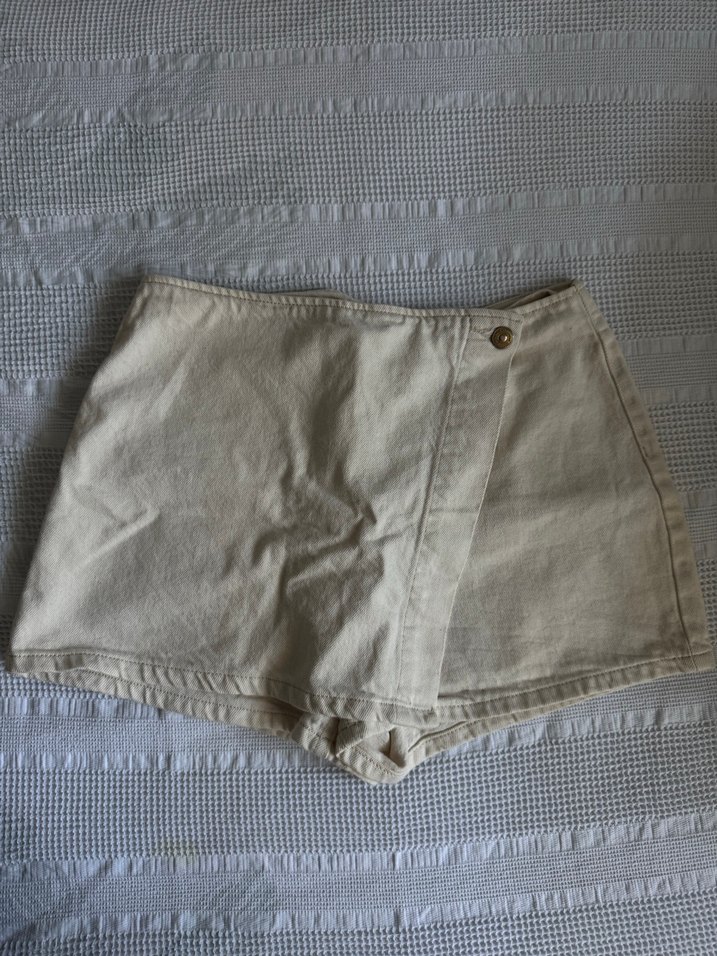 Bej renkte keten mini şort, düğme detayı ve bol kesimiyle rahat bir kullanım sunar. Günlük sokak stiline uygundur.
