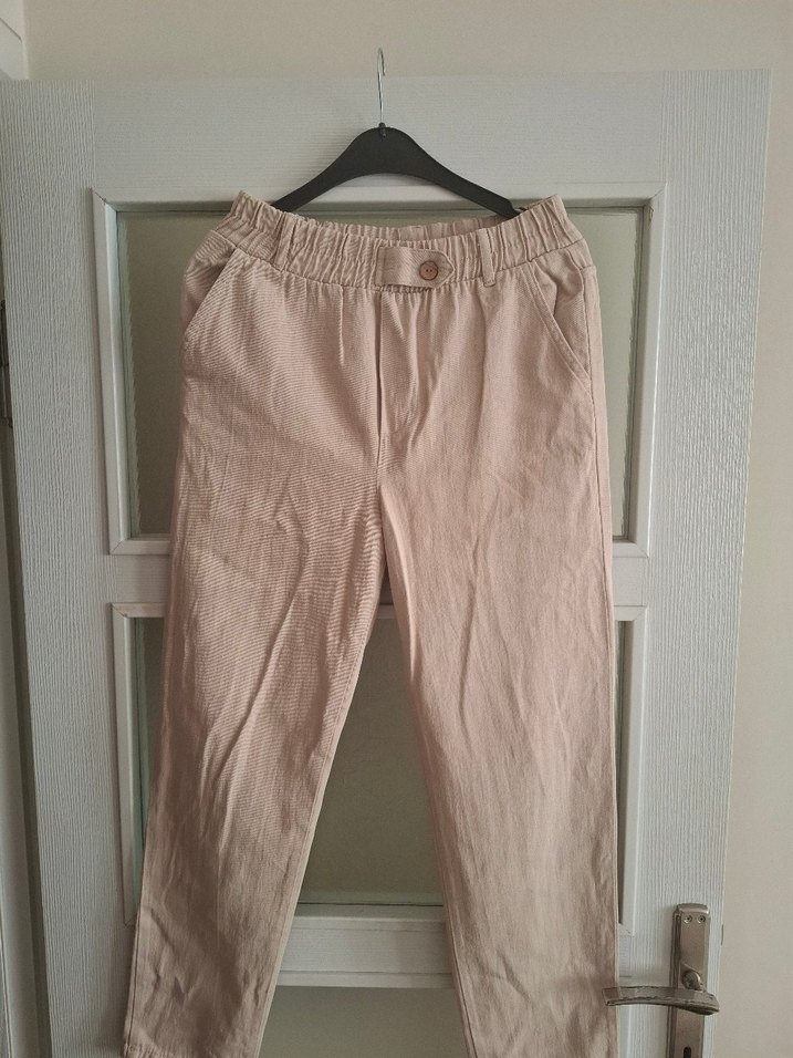 Düğmeli, keten kumaştan, rahat kesim bej pantolon. Midi boyda, pastel tonlarda, günlük kullanıma uygun şık ve sade tarzda.