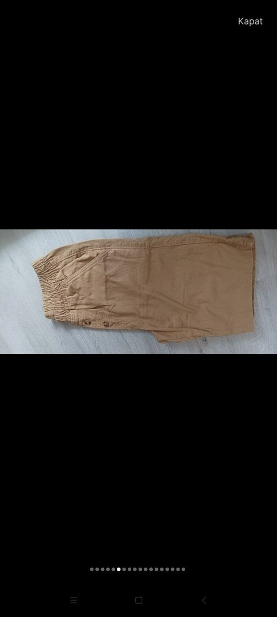 Bej renkli keten kumaştan, düğme detaylı, bol kesim ve midi boy kadın pantolon. Elastik bel ile rahat kullanım sağlar. Minimalist ve desensiz tasarım, günlük kullanım için uygundur.