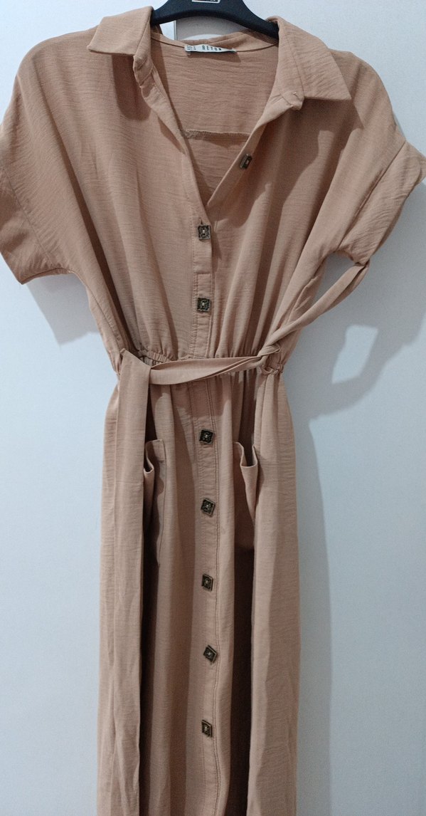 Bej keten kumaştan, düğmeli, kısa kollu ve yakalı uzun elbise. Belde kemer ve rahat kesimle günlük kullanıma uygun bohem tarzda.